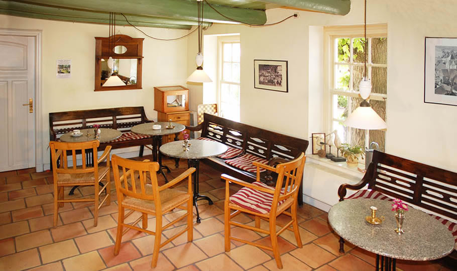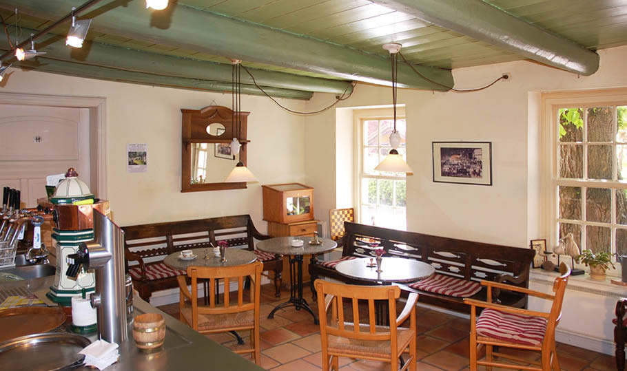 Der Eintritt durch die handgeschnitzte Holztür in dem Schankraum lässt einfache Materialien erkennen. Schwere rustikale Holzmöbel im alten Stil passen sich nahtlos in die ebenso schlichte wie klare Behandlung der Räumlichkeit ein. Sie ist charakterisiert durch eine raumübergreifende Holzbalkendecke und einen rauen Terrakotta Boden. Holz, Stein und dunkles Metall geben Wärme und Halt und stehen ansonsten rein im Dienste des Gebrauchs. Sie verbitten sich jeglichen Anspruch auf einen hervortretenden Gestaltungsbeitrag.