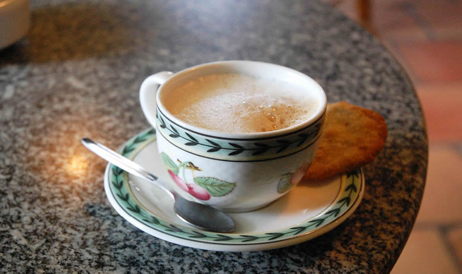 Der Eintritt durch die handgeschnitzte Holztür in dem Schankraum lässt einfache Materialien erkennen. Schwere rustikale Holzmöbel im alten Stil passen sich nahtlos in die ebenso schlichte wie klare Behandlung der Räumlichkeit ein. Sie ist charakterisiert durch eine raumübergreifende Holzbalkendecke und einen rauen Terrakotta Boden. Holz, Stein und dunkles Metall geben Wärme und Halt und stehen ansonsten rein im Dienste des Gebrauchs. Sie verbitten sich jeglichen Anspruch auf einen hervortretenden Gestaltungsbeitrag.